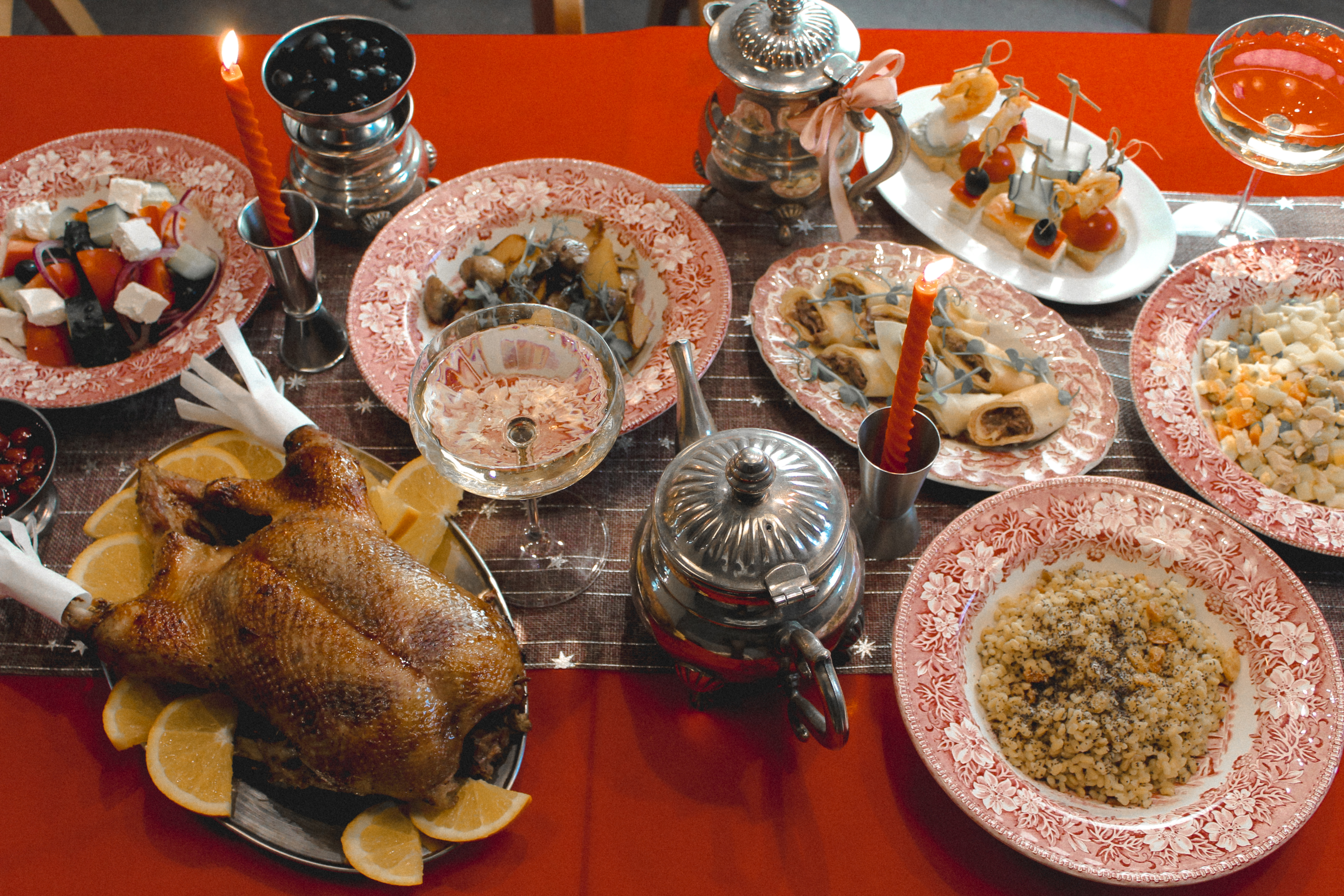Склад: <br>Запечена качка 2 кг <br>Картопля з грибами по-домашньому 450 г <br>Батат з трюфельним айолі 250 г <br>Олівє 300 г <br>Грецький салат 300 г <br>Кутя 600 г <br>Шуба 300 г <br>Млинці з лососем гравлакс 250 г <br>Млинці з щокою та соусом Black Pepper 200 г <br>Канапе з лососем гравлакс і гуакомоле 6 шт <br>Канапе з креветкою та гуакомоле 6 шт <br>Міні-тости з тюлькою 12 шт <br>Солоні круасани з начинками 12 шт <br>Штолен 250 г