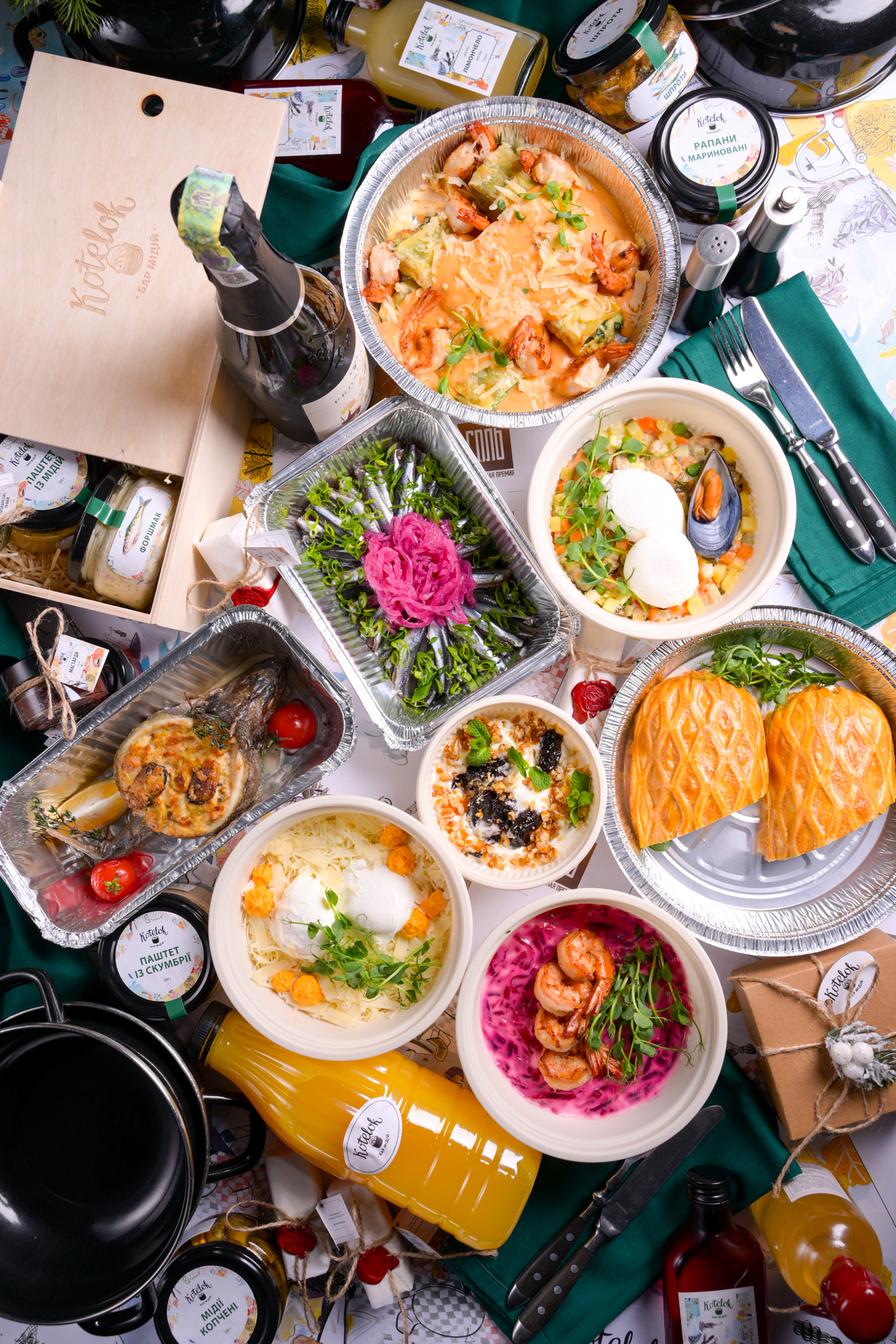 креветки коктейльні, хвости тигрових креветок, картопля, буряк, морква, цибуля шалот, майонез власного виробництва.