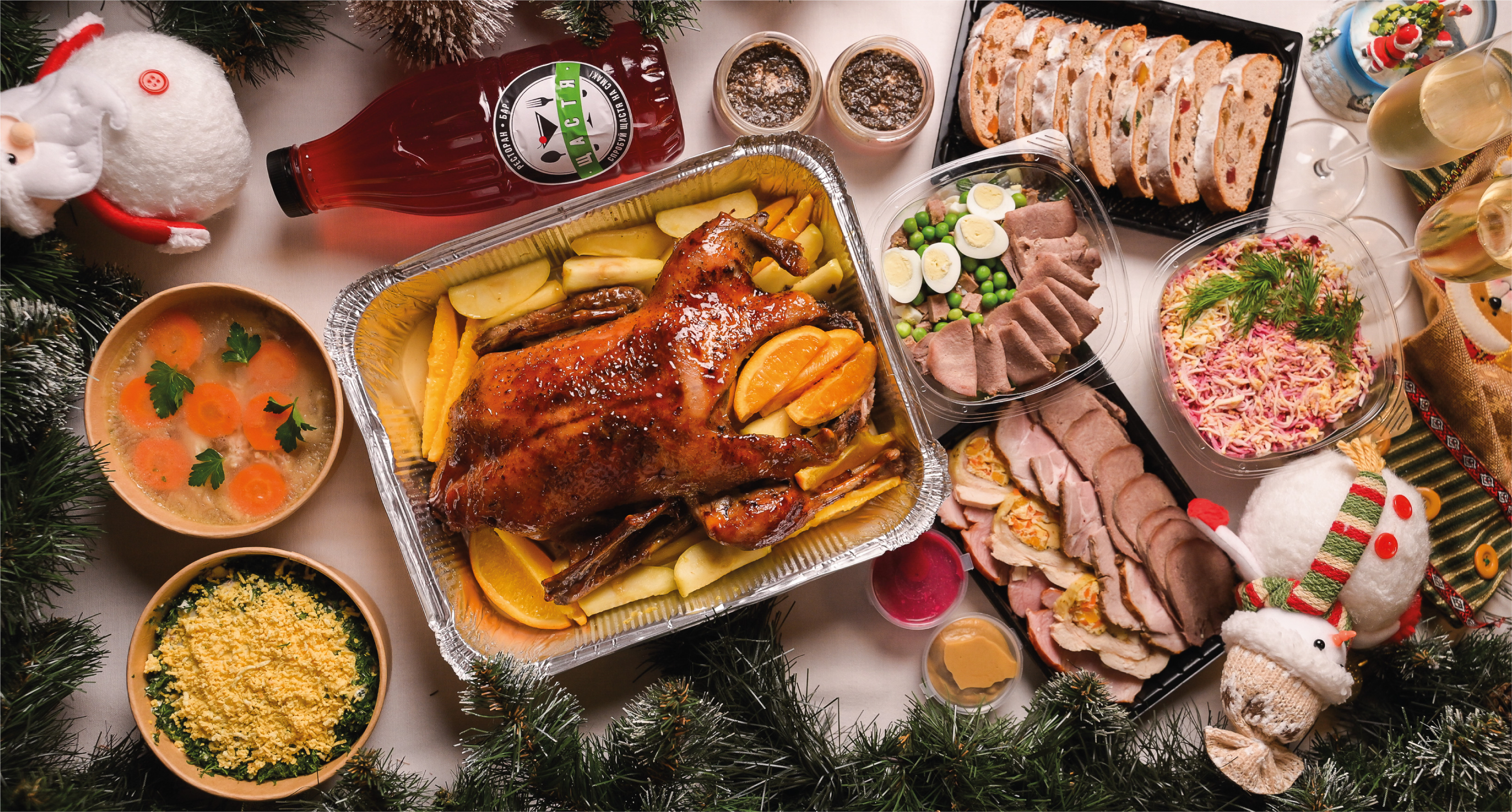 Торт печінковий 500 гр <br>Холодець з домашньої курки 500гр <br>Качка з яблуками 1500 гр <br>Сет домашнього м'яса 400 гр <br>Мус із курячої печінки 200гр <br>Олів'є з язиком 500гр <br>Оселедець під шубою 500гр <br>Штоллен 400 гр <br>Компот 1л <br>