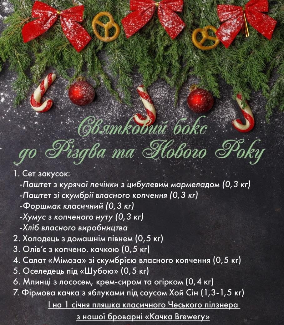 Олів'є з качкою 0,5 кг <br>Оселедець під "Шубою" 0,5 кг <br>Салат "Мімоза" зі скумбрією власного копчення 0,5 кг <br>Холодець з домашнім півнем 0,5 кг <br>Форшмак класичний 0,3 кг <br>Паштет курячий 0,3 кг <br>Хумус з копченого нуту 0.3кг <br>Паштет з коченої скумбрія 0.3кг <br>Хліб власного виробництва <br>Млинці з лососем крем-сиром та огірками 0.4 кг <br>Фірмова качка ціла 1,5 кг <br>Та пляшка Класичного Чеського пілзнера у подарунок з нашої броварні