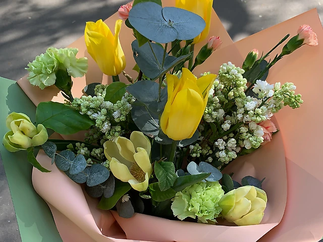 Букет з леукоспермумом, хвоєю, ілексом, скімією, анігозантосом та апельсином