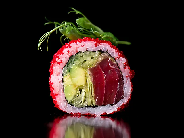 Рис, норі, крем-сир, тунець, червона ікра, ікра летючої риби, огірок, авокадо, соус унагі.