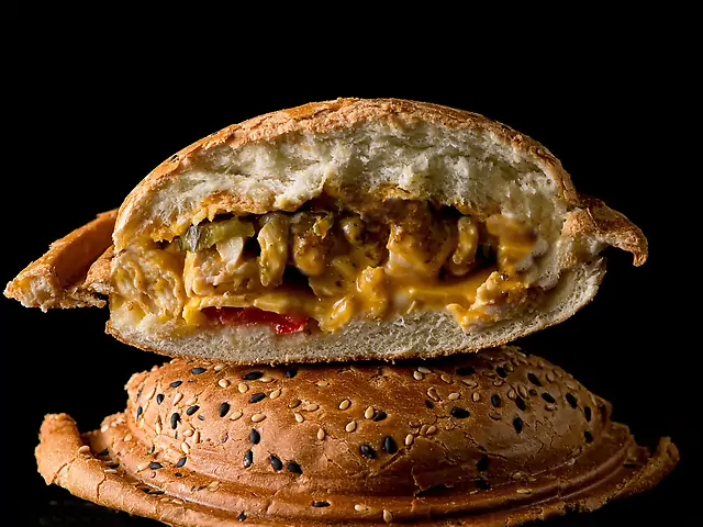 Сухарики, смажене куряче філе, пармезан, чері, огірок, соус медово-гірчичний, яйце перпелине, соус цезар.